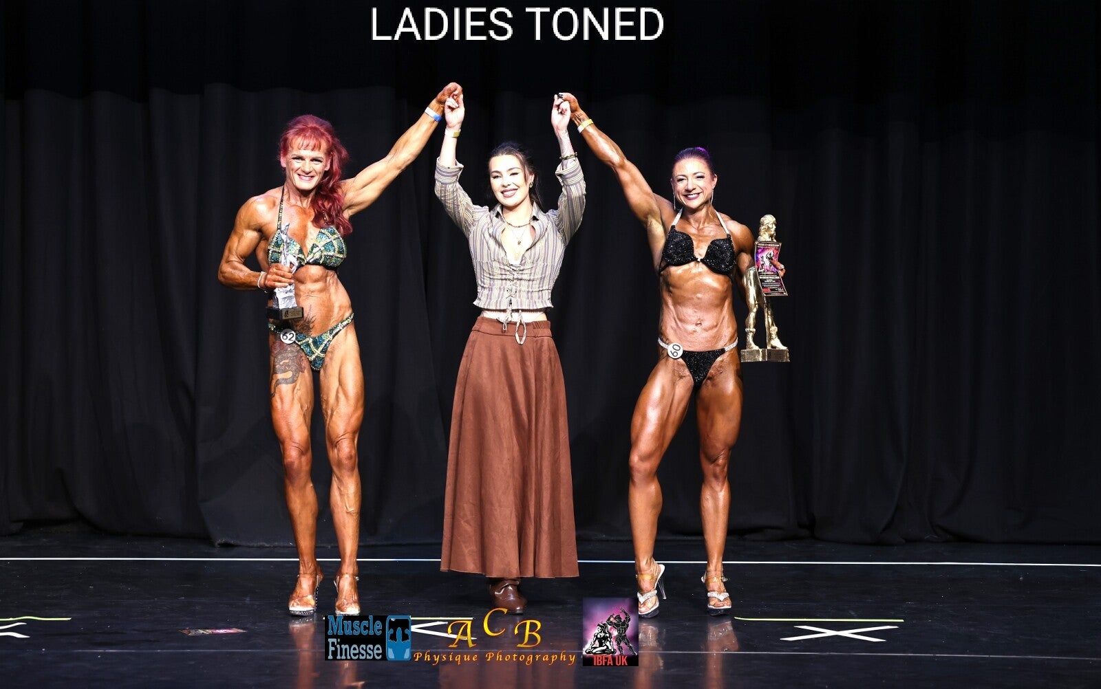 OVERALL LADIES WINNER - SHANICE LAW WITH IBFA PRESIDENT MATTHEW ALI & CRAIG HARRIS